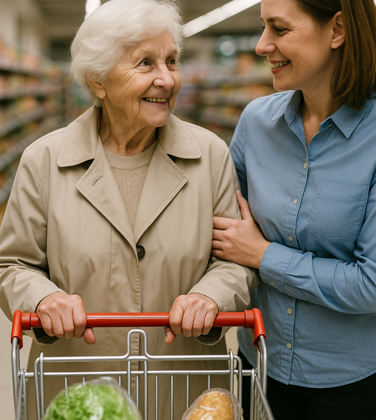 Wir übernehmen Ihre Einkäufe oder gehen gemeinsam mit Ihnen los. Dabei achten wir auf Ihre Wünsche, Lieblingsprodukte und Besonderheiten wie Unverträglichkeiten. Anschließend räumen wir alles in Ruhe ein, damit Sie gut versorgt sind.
